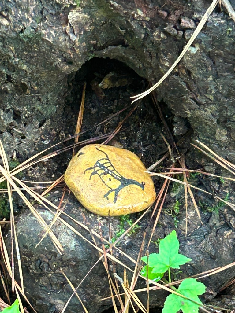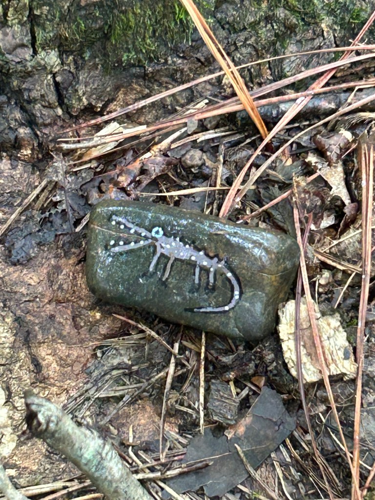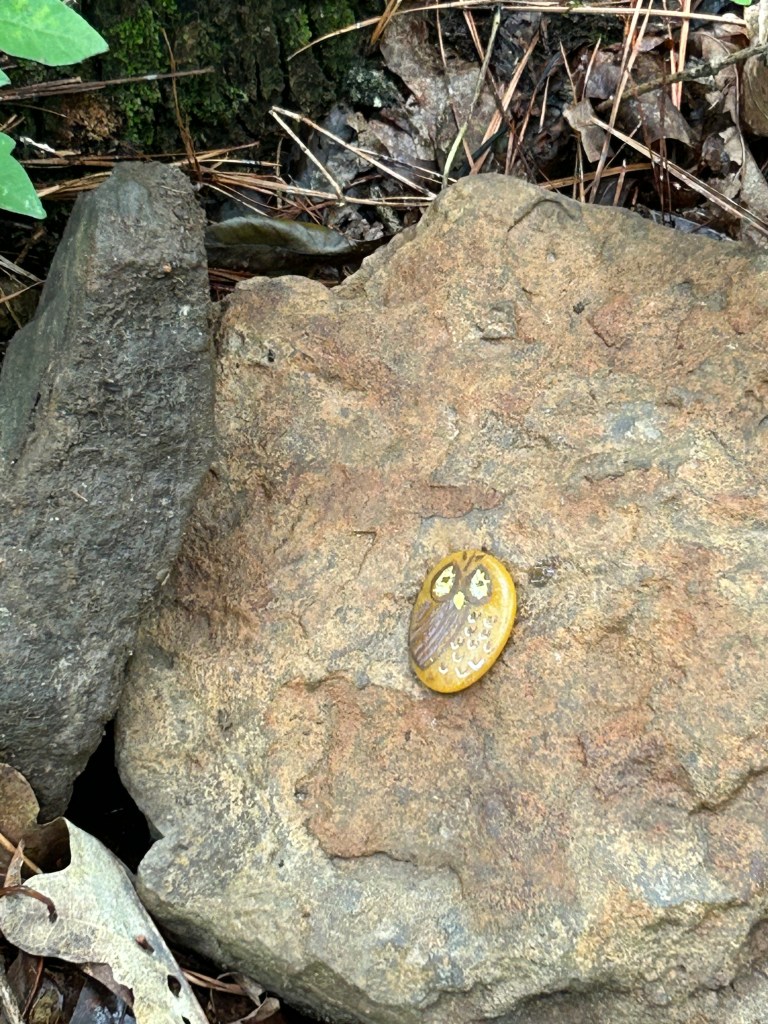 I decided to start hiding the painted rocks today, so Cheryl and I hid 15 painted rocks along Carterville Loop. All of the rocks are painted with waterproof acrylic. Most have Indian designs.